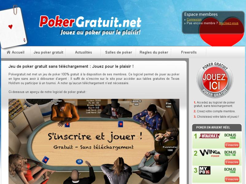 Jouer au poker sans argent sur pokergratuit. Le logiciel de poker en ligne est en flash et ne demande donc pas de téléchargement. Il vous suffira de moins de 3 minutes pour vous inscrire et commencer à vous amusez en affrontant d'autres joueurs de la France entière! Aujourd'hui c'est plus de 20 000 membres qui se retrouvent pour disputer des parties de cash game endiablées.