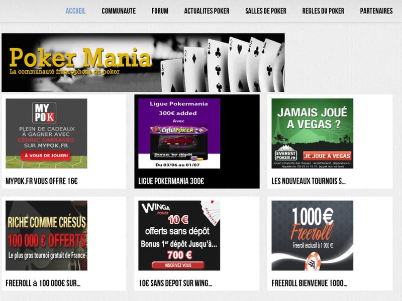 Poker Mania est une communauté poker qui organise plusieurs événements de poker privé tels que des freeroll, championnats, ligues, Tournois bounty, jeux concours... Leurs tournois privés ont toujours de l'argent ou des tickets ajoutés aux prix afin de permettre aux joueurs de monter leurs bankroll plus facilement. Un forum complet est aussi à votre disposition, vous pourrez partager, échanger, apprendre, progresser et bien plus. Tous ce dont vous avez besoin pour jouer au poker en ligne ce trouve sur poker-mania